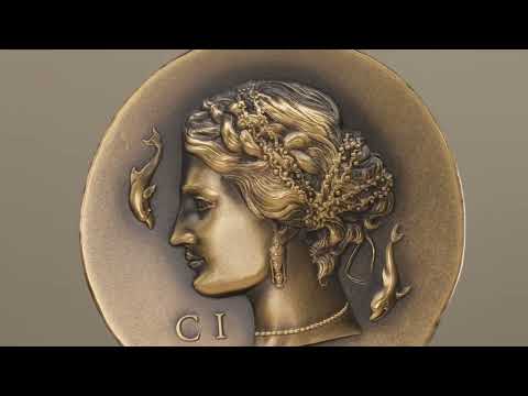 Úchvatná zlatá mince zobrazující Arethusu, podmanivou nymfu, která dle řecké mytologie byla společnicí měsíční bohyně Artemis. Mince je vyražena ve velikosti jedné unce v kvalitě Antique finish.